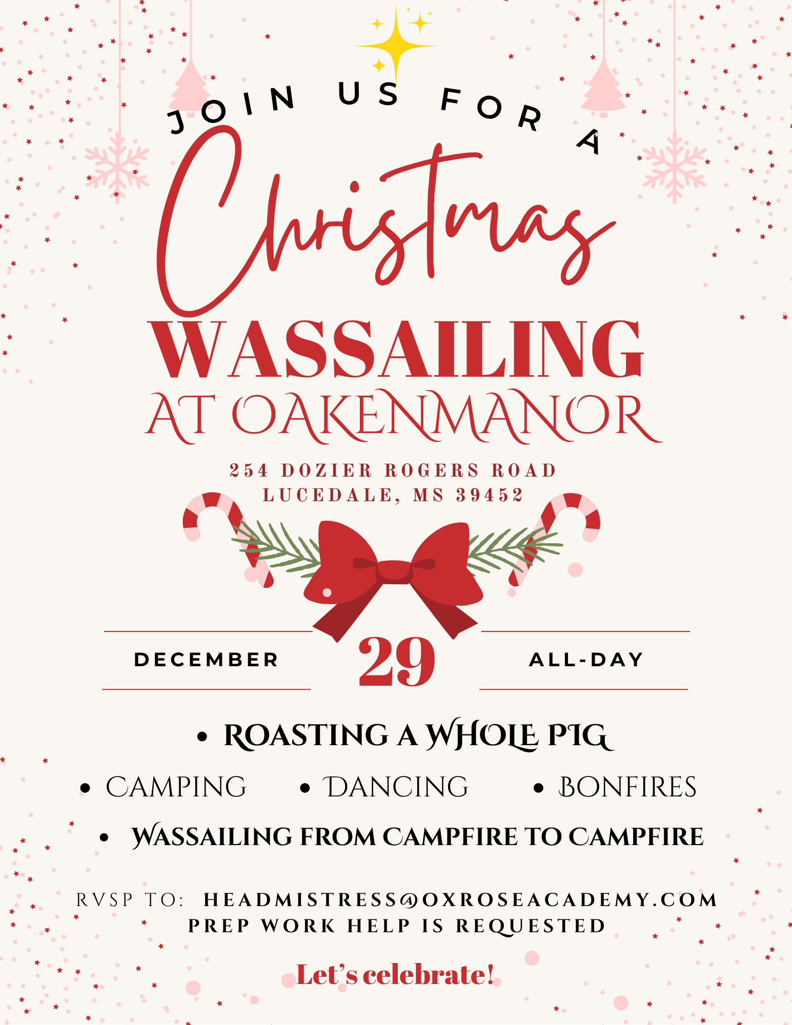 - 🎄RSVP Alecia Rolling at headmistress@oxroseacademy.com if attending the ‼️Oakenmanor 5th Day of Christmas Wassail‼️in Lucedale, Mississippi; plenty of camping space. Hotels are 30-45 minutes away. Families may arrive any time after December 25th and be involved with the party preparations.